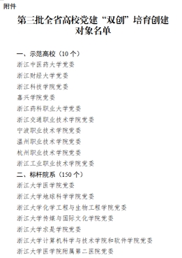 近日,浙江省教育厅公布了第三批全省高校党建“双创”培育创建对象,确定10所党建工作示范高校、150个标杆院系为第三批全省高校“双创”培育创建对象。浙江科技学院博彩平台网址大全