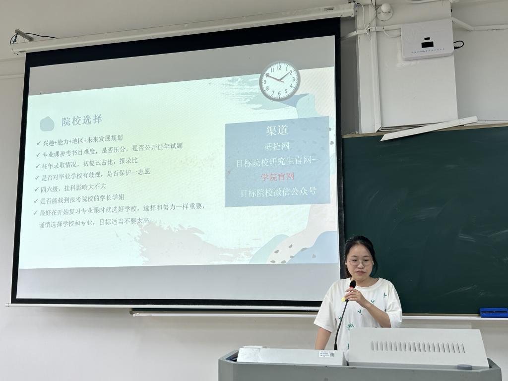 会上,杜策介绍了学院2023届考研相关情况,鼓励同学们尽早树立职业目标,做好人生规划,同时着重分析了当前就业形势,建议同学们根据自身实际选择好发展方向和学历提升路径。杜策表示,学院高度重视学风建设工作,会积极助力同学们学历提升,通过优化考研环境、加强考研交流培训、扩大考研信息渠道等系列举措,做好服务工作。