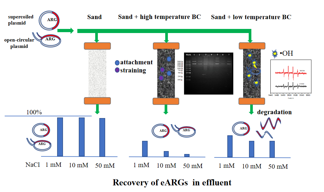 研究发现生物质炭能显著抑制胞外抗生素抗性基因的水平基因转移能力。低温(300 °C)生物质炭体系诱导质粒缩合反应,降低感受态细菌的细胞膜通透性,从而阻止感受态细菌对质粒的吸收和转化。高温(700 °C)生物质炭颗粒对质粒具有很强的不可逆吸附作用,被生物质炭吸附的质粒几乎不能被感受态细菌所利用而发生水平基因转移。同时,研究进一步发现生物质炭能有效降低胞外抗生素抗性基因在多孔介质中的迁移能力。在迁移过程中,高温(700 °C)生物质炭主要通过增加吸附容量、粘附作用(attachment)和筛滤作用(straining)等机制抑制了胞外抗生素抗性基因的迁移能力。低温(300 °C)生物质炭主要通过诱导羟基自由基的产生,使得开环质粒受到了碎片化损伤而失去活性,从而抑制了胞外抗生素抗性基因的迁移。上述研究成果将为缓解水土介质中抗生素抗性基因的传播扩散提供新的解决思路。(博彩平台网址大全