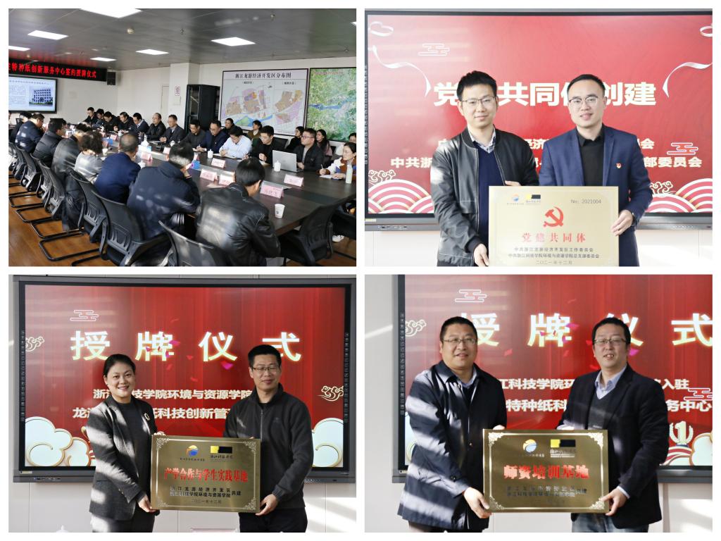 随后,签订了我校入驻“龙游县特种纸科技创新管理服务中心”服务协议;创建了党建共同体;颁发了技术负责人、专家顾问团聘书;并举行了产学合作与学生实践基地、师资培训基地、党建共同体的授牌仪式。
