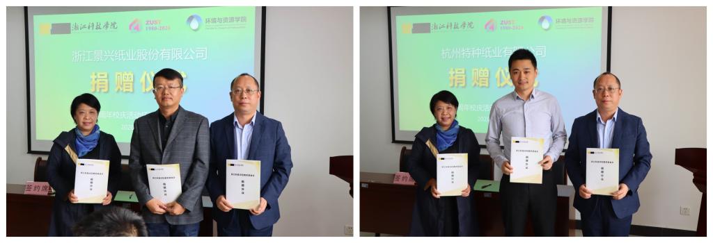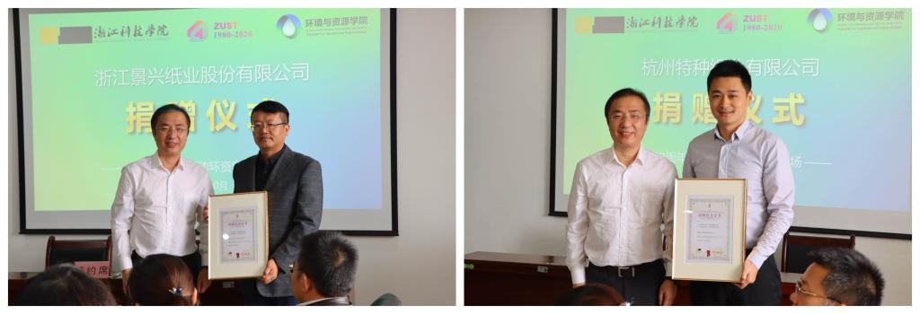 捐赠仪式上,浙江景兴纸业股份有限公司向学校教育基金会捐赠100万元,杭州特种纸业有限公司捐赠100万元。万健向景兴纸业王志明总经理、杭特纸业王建业总经理颁发捐赠证书。