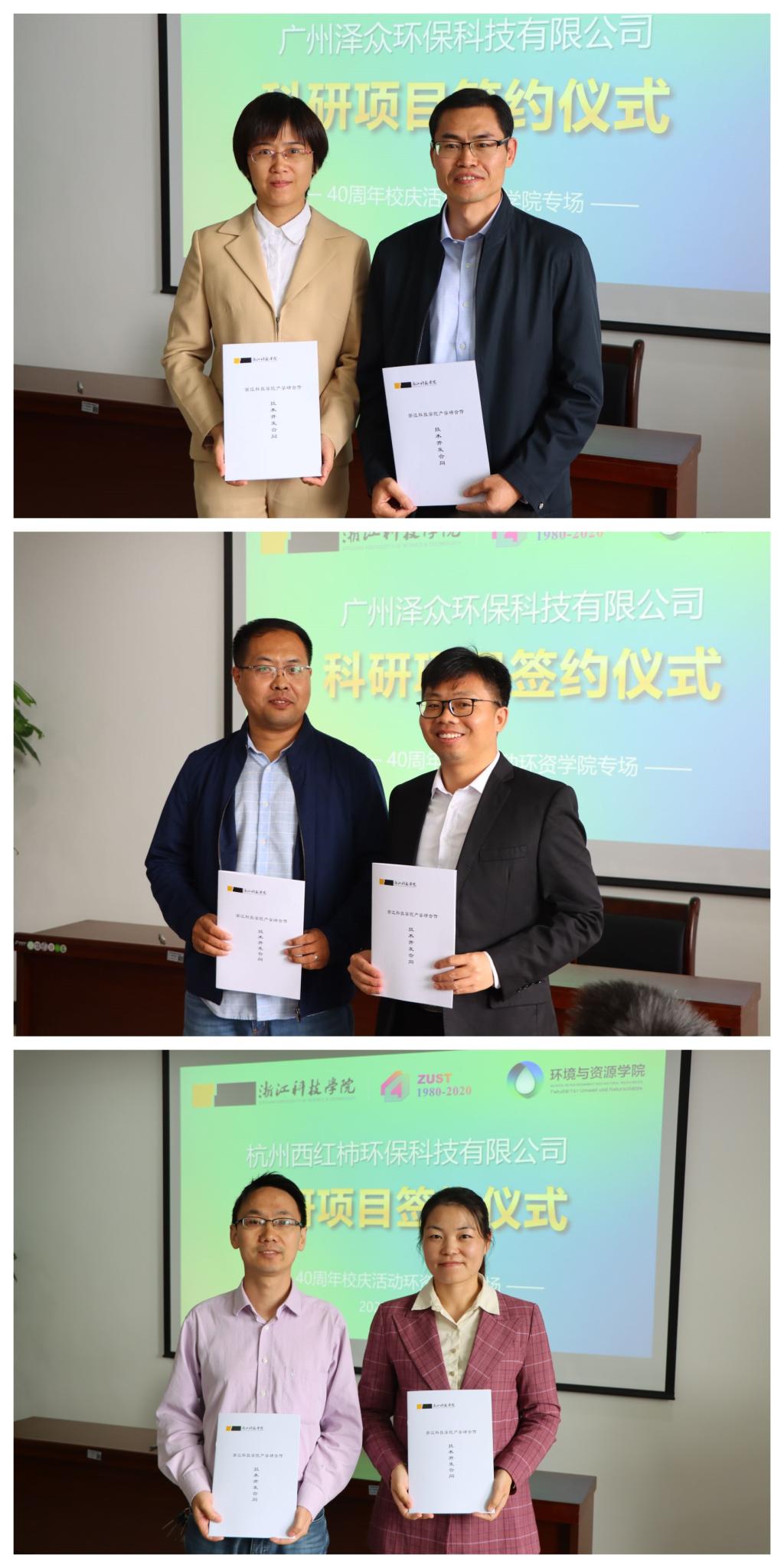 活动中,张学金副院长和浙江金龙再生资源科技股份有限公司陈欢欢副总经理签订科研开发合同,项目总经费160万元;柴彦君博士和广州泽众环保科技有限公司项目部蒋泰隆经理签订科研开发合同,项目总经费152万元;陈华博士和杭州西红柿环保科技有限公司陈波总经理签订科研开发合同,项目总经费200万元。