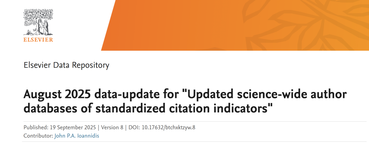 9月19日,美国斯坦福大学(Stanford University)和国际权威学术出版社爱思唯尔(Elsevier)共同发布2025年全球前2%顶尖科学家榜单(World's Top 2% Scientists)。榜单共分为“终身科学影响力榜单”——关注整个学术生涯迄今的影响力,和“年度科学影响力榜单”——聚焦本年度(2025年)的学术成就。