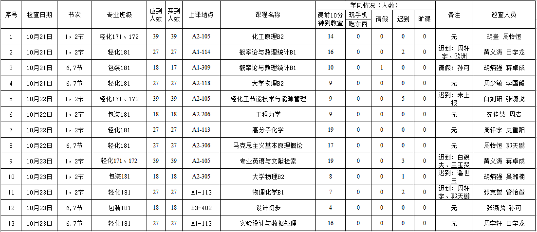 本周学风巡查中没有出现玩手机和在教室吃早餐的现象,但是提前十分钟到达教室的同学明显减少,大部分同学是在上课前一两分钟才到达教室。而且18级迟到现象严重,而且是固定的一两名同学,可能与运动会期间排练过于劳累有关,希望学委能够多加注意,及时提醒。