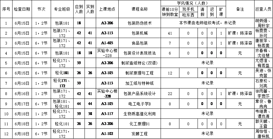 周二34节:轻化171、172班,《过程控制》,许银超老师,应到37人,实到37人,其中,迟到2人;包装181《包装材料学》,陈文革老师,应到18人,实到18人;