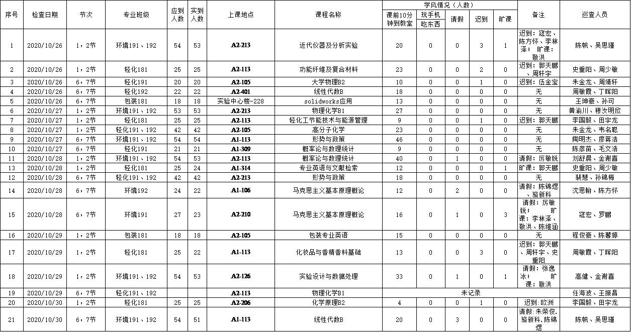 本周教学期间,并未出现吃早餐以及玩手机的同学,请假累计8人,迟到11人!旷课6次!较上周出现明显退步,过多同学放松,没有认真遵守学校规定时间,甚至出现无端旷课,这是非常不好的现象。希望同学们不要三分钟热度,继续保持开学时的学习热情,进入学习状态。希望各班认真反思,学委能够提醒班级同学,提前十分钟到达教室,争取不要迟到和旷课,争取下周出现较理想的结果。望各班有则改之,无则加勉。