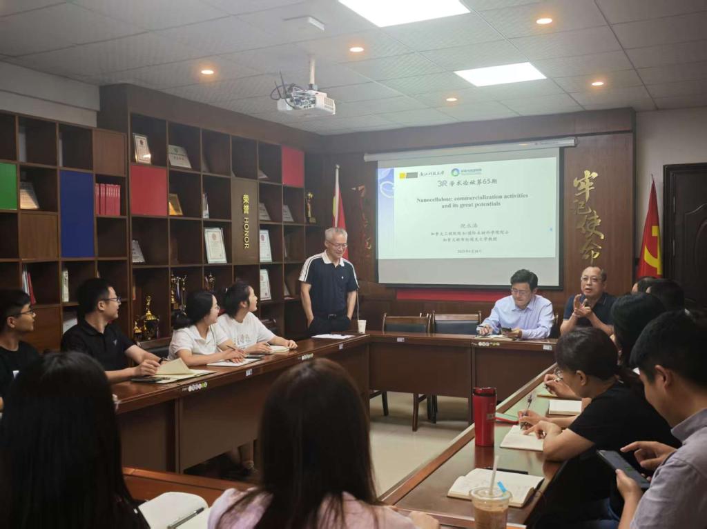 并作“3R”论坛第65期学术报告“Nanocellulose: Commercialization Activities and Its Great Potentials”。报告由学院院长沙力争教授主持,轻化工程系教师、研究生等30余人参加了报告会。