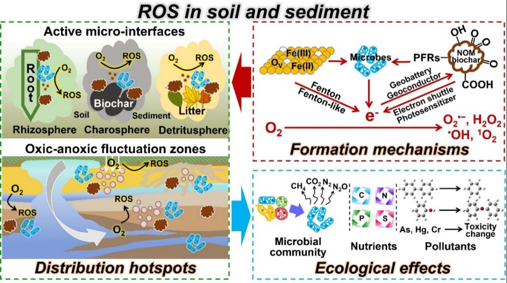 文中首先总结了当前先进的活性氧(Reactive Oxygen Species,ROS)检测方法,界定了ROS在土壤和沉积物中的分布热区为活性微界面与氧化还原波动区,继而概述了天然有机质(NOM)、生物炭、过渡金属及微生物生成ROS的过程及机制,探讨了ROS对微生物群落、养分循环及污染物转化的影响,最后提出了发展ROS原位检测技术、解析痕量组分交互机制及推动ROS在土壤污染修复中的实际应用等未来研究方向,为绿色低碳发展原则下土壤固碳与污染修复提供科学依据。